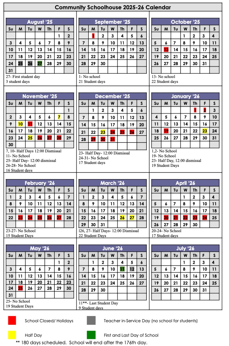 In the winter months, school cancellations and delays will be decided by school administration. Community Schoolhouse will send out both voice and email cancellations. If we have school and your student's district does not, the student is excused from school that day.